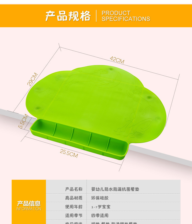 3、防水抗菌餐墊,卡通圖案讓寶寶享受快樂(lè)的用餐環(huán)境,不用擔(dān)心餐桌或者其他地方的細(xì)菌會(huì)感染給寶寶,媽媽安心!