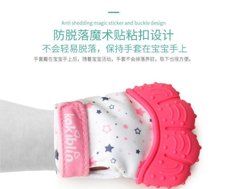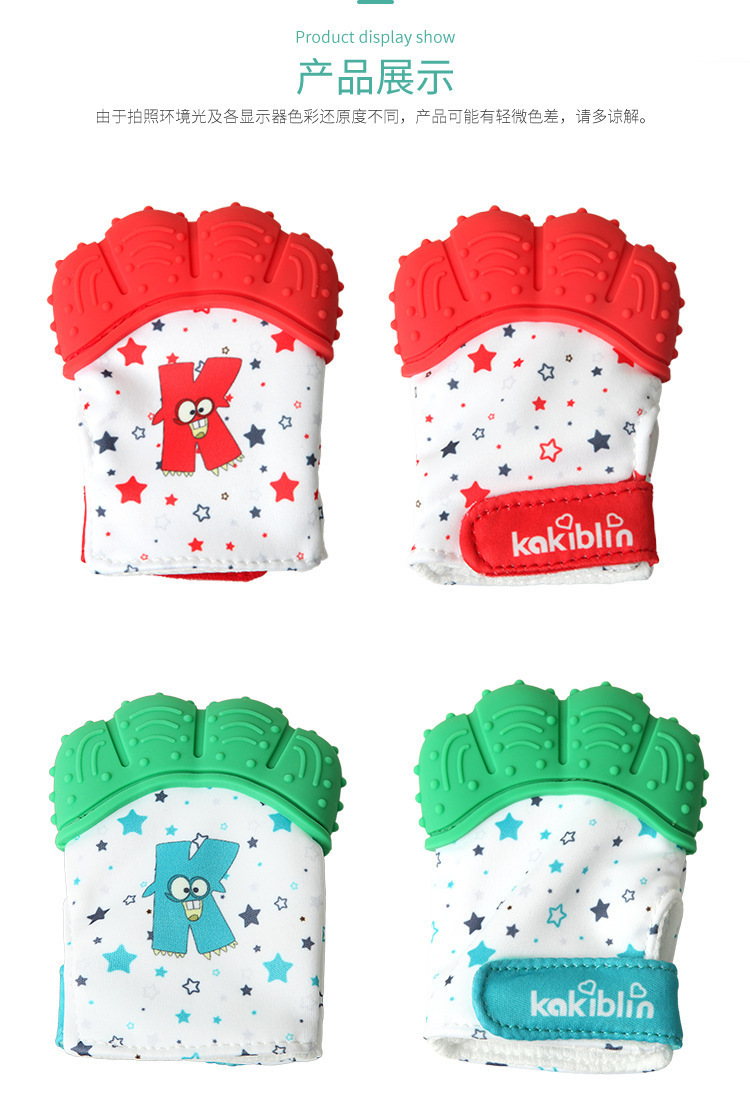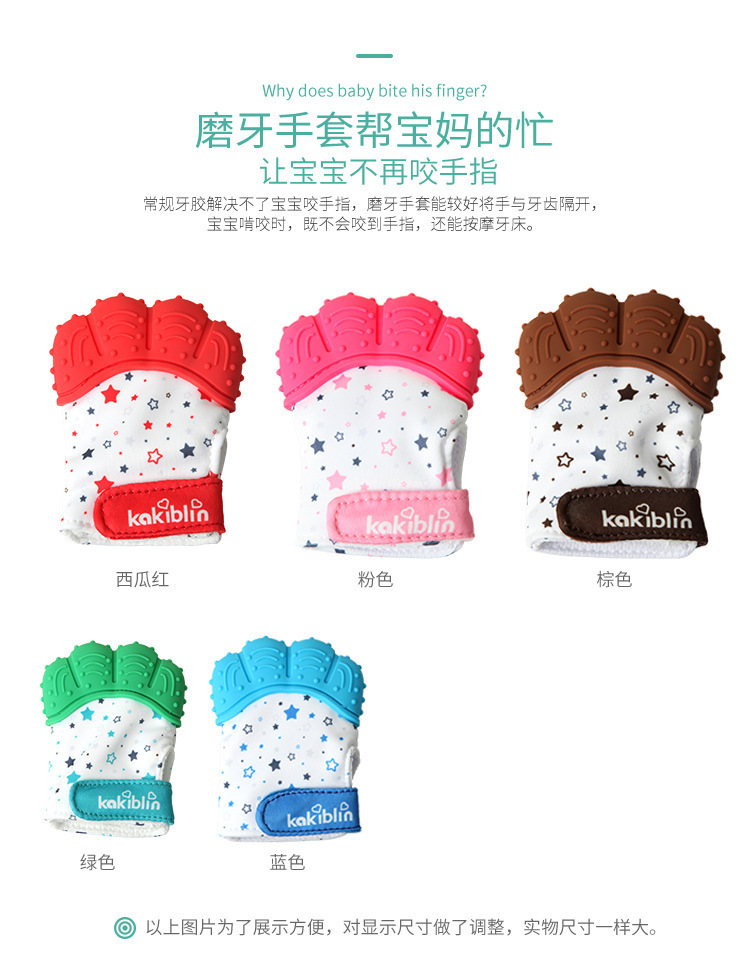 產(chǎn)品用途:牙膠手套可以更好的將手和牙齒隔開,寶寶啃咬時(shí),既不會咬到手指,還可以按摩牙床。