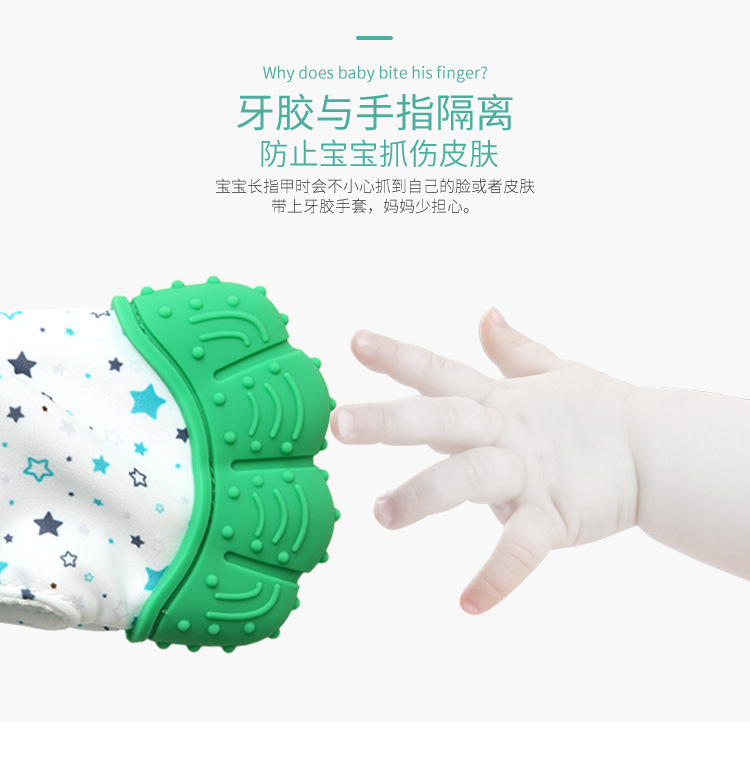 4、常規(guī)牙膠解決不了寶寶咬手指,磨牙手套能較好將手與牙齒隔開,寶寶啃咬時(shí),既不會咬到手,還能按摩牙床。
